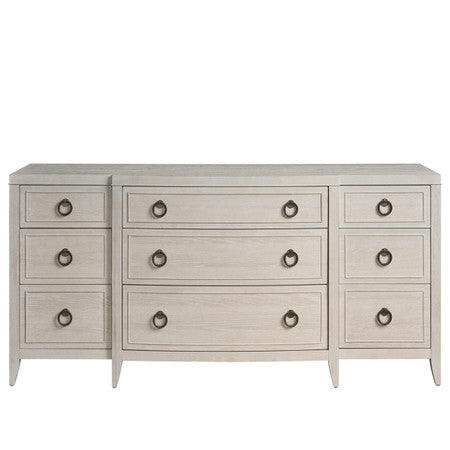 The Avaline Dresser, a study in refined elegance, offers ample storage with nine spacious drawers. The top center drawer, lined with gray felt, provides a secure haven for delicate jewelry. Its White Oak finish lends a timeless appeal to any bedroom.