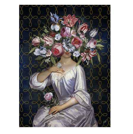 Blinded by an explosion of flowers shaped like a headdress, Beautiful Dreamer Silver contemplates a delicate white butterfly on her raised arm and holds a single rose à la Marie Antoinette in her other hand. The luminous ivory gown she is wearing is reminiscent of the wealth of the ancien regime in France and royalty in Great Britain. We also offer the Beautiful Dreamer with a silver background.