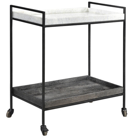 Roll into cocktail hour with modern style and a beautiful mix of materials. This bar cart's simple two-shelf design puts all eyes on the white marble and black mango wood details of the 32" trays. Featuring a slim, gunmetal iron frame supported by four locking caster wheels that anchor the cart so you can safely mix drinks or serve coffee to guests.