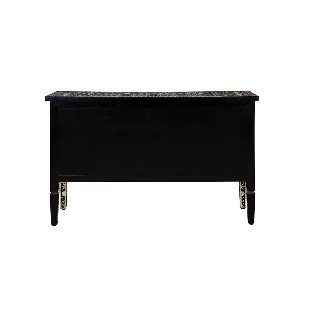Introducing the Mogli Chest, a stunning furniture piece featuring a black base adorned with exquisite shell and bone inlay. This ancient technique, dating back to the days of ancient Egypt, brings a luxurious touch to the chest that enhances any space. With two spacious drawers, the Mogli Chest provides both functionality and elegance, making it a perfect and unique addition to a bedroom or guest room.