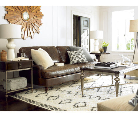 Traditional living room furniture design meet relaxed modern industrial design in our Proximity Wood and Bronze Metal Cocktail Table Set. Crafted of solid hardwood, cherry and pecky pecan wood veneers in a dark, lightly distressed Sumatra finish. Our rustic industrial style coffee table sets feature heirloom-quality construction, oiled bronze metal finished turned legs, metal frame, posts and stretchers. With its luxurious rivet detailing, this 2 piece coffee table set brings urban elegance into your livingroom decor.