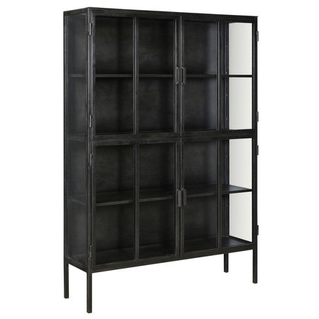 Keep your bedroom, kitchen, or living room organized with our stylish Roman Cabinet. Four glass doors with a bar pull open designed to keep dust away from your keepsakes. Featuring an industrial minimalist design and finished with antique gunmetal framing and shelves.