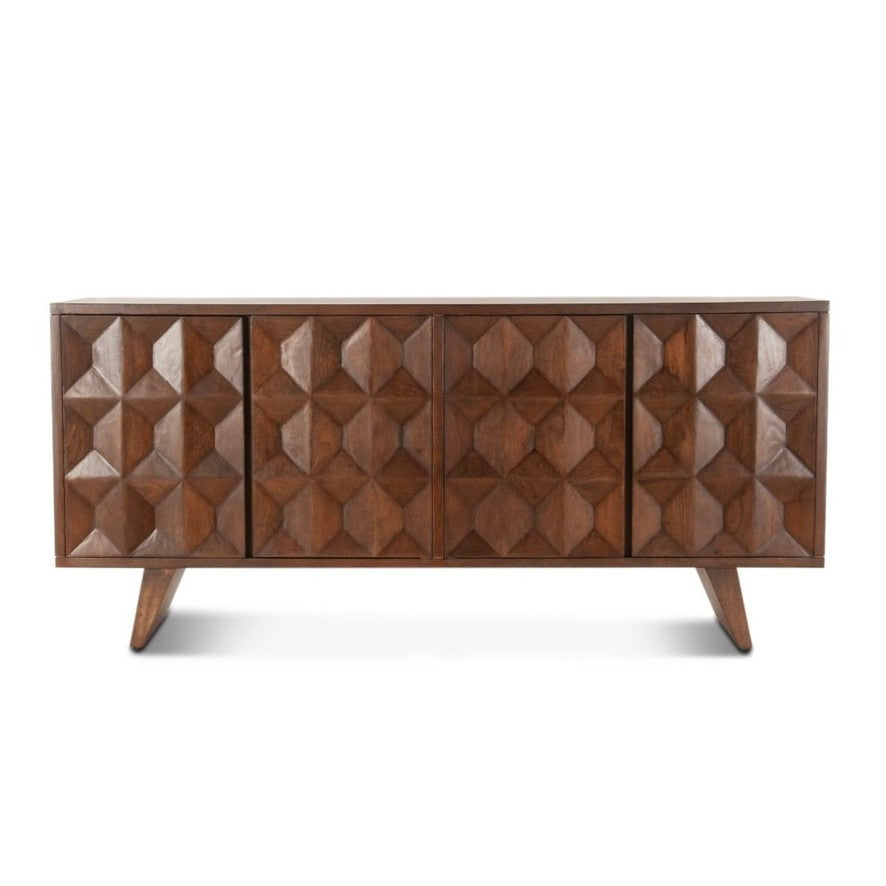 - Solid mango wood construction with carved cabinet doors in a rich matte brown finish